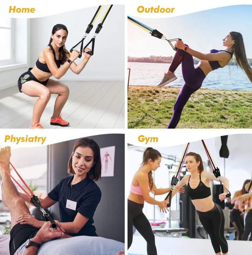 Obtén un equipo de entrenamiento completo para tu gimnasio en casa, incluyendo bandas de ejercicio con ancla de puerta, cuerda elástica para tirar y expansor. Realiza una amplia gama de ejercicios para fortalecer todos los grupos musculares y alcanzar tus objetivos de fitness desde la comodidad de tu hogar.