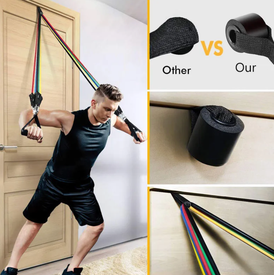 Nuestro Conjunto de bandas de resistencia para Fitness es ligero y fácil de transportar, permitiéndote mantener tu entrenamiento incluso en tus viajes. Además, su diseño compacto y la inclusión de un ancla de puerta te brindan la libertad de ejercitarte en cualquier espacio, sin necesidad de una costosa maquinaria de gimnasio.