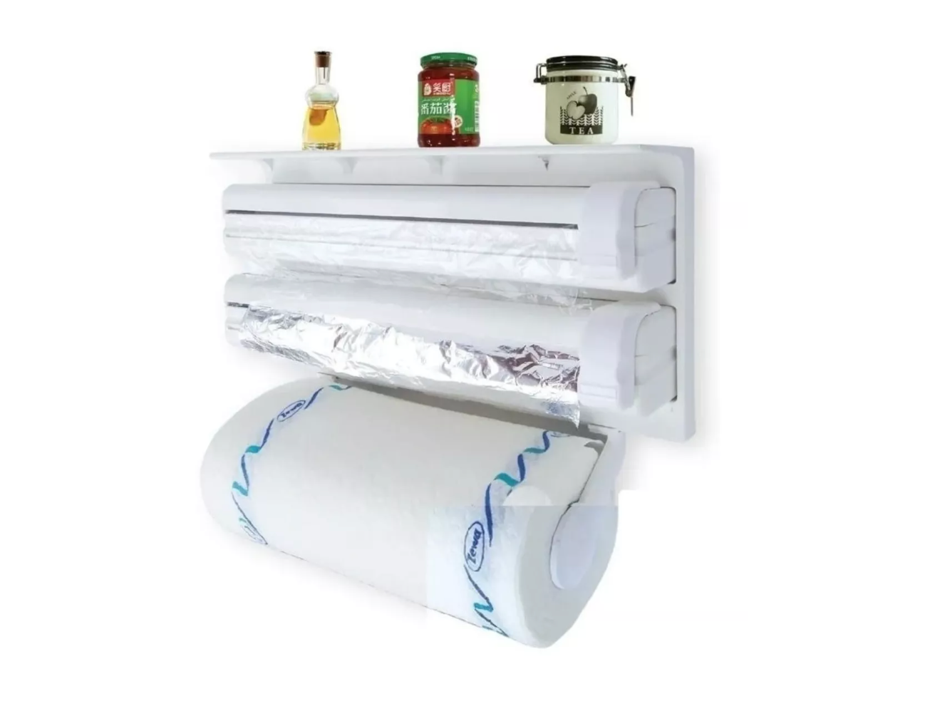 Este dispensador de rodillos, Es el accesorio de cocina perfecto para la comodidad en las necesidades del hogar. Puede contener tres rollos de cocina diferentes, como papel de cocina, papel de aluminio y papel de plástico. Con su diseño rectangular, el estante superior se puede utilizar para almacenar frascos de especias. Mecanismo con dos cuchillas integradas para un corte fácil y seguro. Los rodillos se pueden cambiar fácilmente.Característica:Tiene capacidad para 3 rollos diferentesPuede servir como un estante para frascos de especiasHay 2 cuchillos incorporados para cortar fácilmente la láminaTamaño: 39 x 10 x 25 cmGARANTÍA: 30 DÍAS POR DEFECTO DE FÁBRICA.